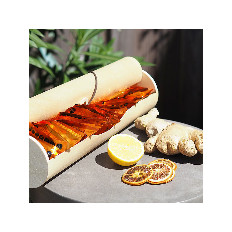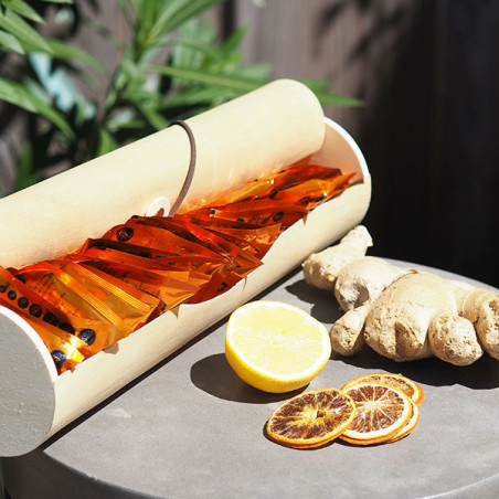 - Thé bien-être « Vitalité » : noix de cola, écorces d’orange, hibiscus et morceaux de cassis