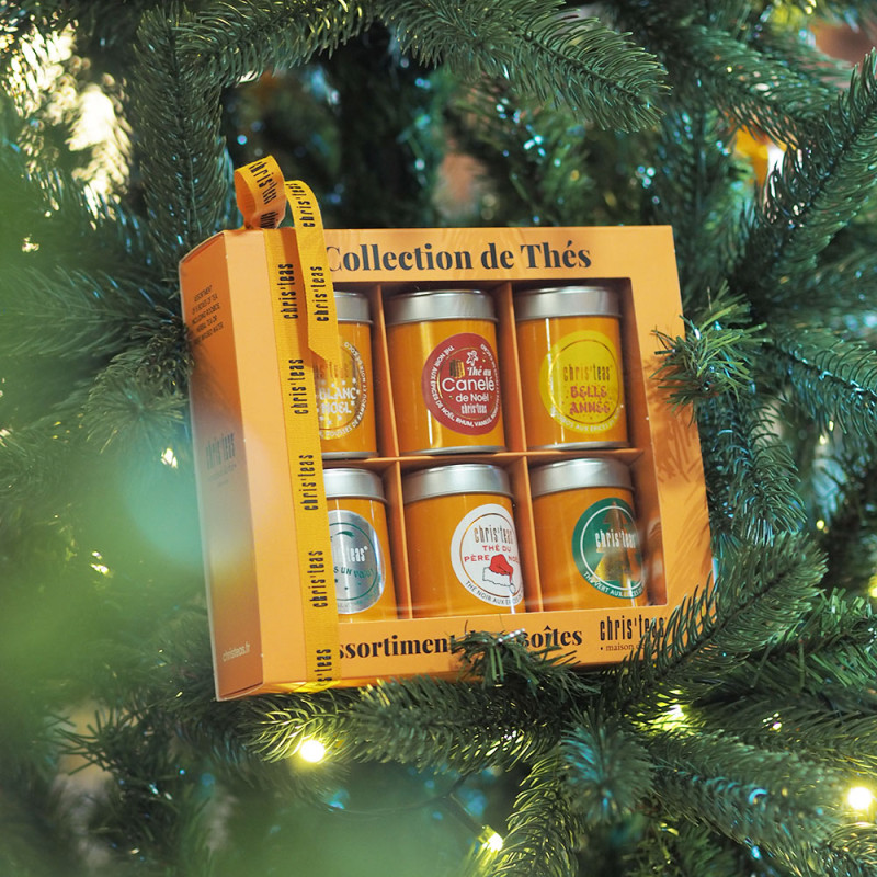 • Thé au Canelé de Noël : thé noir à la vanille, rhum, caramel croquant, épices de Noël, noisettes et fèves de cacao.