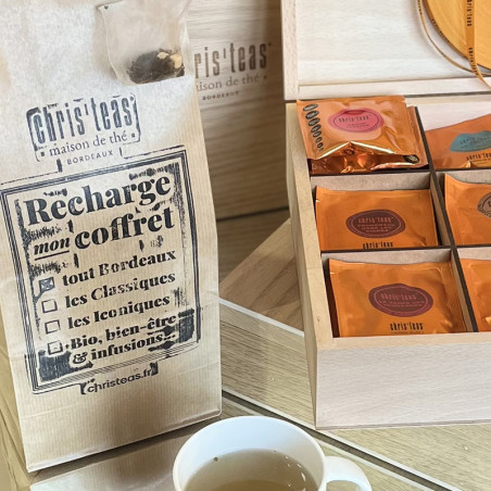 Élégant, durable et rechargeable, ce joli coffret en bois de chêne/hêtre est fabriqué sur mesure, en France, à Vertolaye, spécialement pour les thés en sachets pyramidaux de la maison Chris'teas.