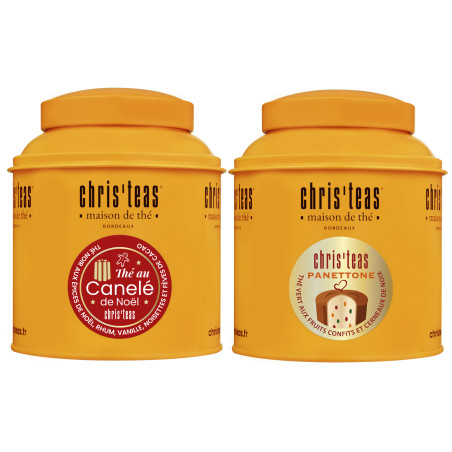 • Thé au canelé de Noël : thé emblématique de la Maison Chris'teas aux saveurs de la célèbre pâtisserie bordelaise, revisité pour Noël avec des épices, de la vanille, des éclats de noisettes et des fèves de cacao. Un arôme envoutant 100% naturel.