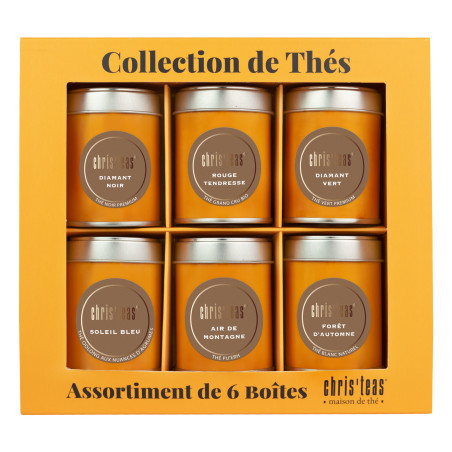 Ce coffret contient un assortiment de 6 boîtes de thés Grands Crus, des thés d'exception, de 25g chacune.