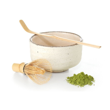 Préparation du Matcha : À l’inverse de tous les autres thés, le Matcha est un thé dont les feuilles ont été réduites en poudre très fine ; ce thé vert n’est donc pas infusé mais battu. Il est préparé à l’aide d’un fouet, d’un bol et d’une spatule.