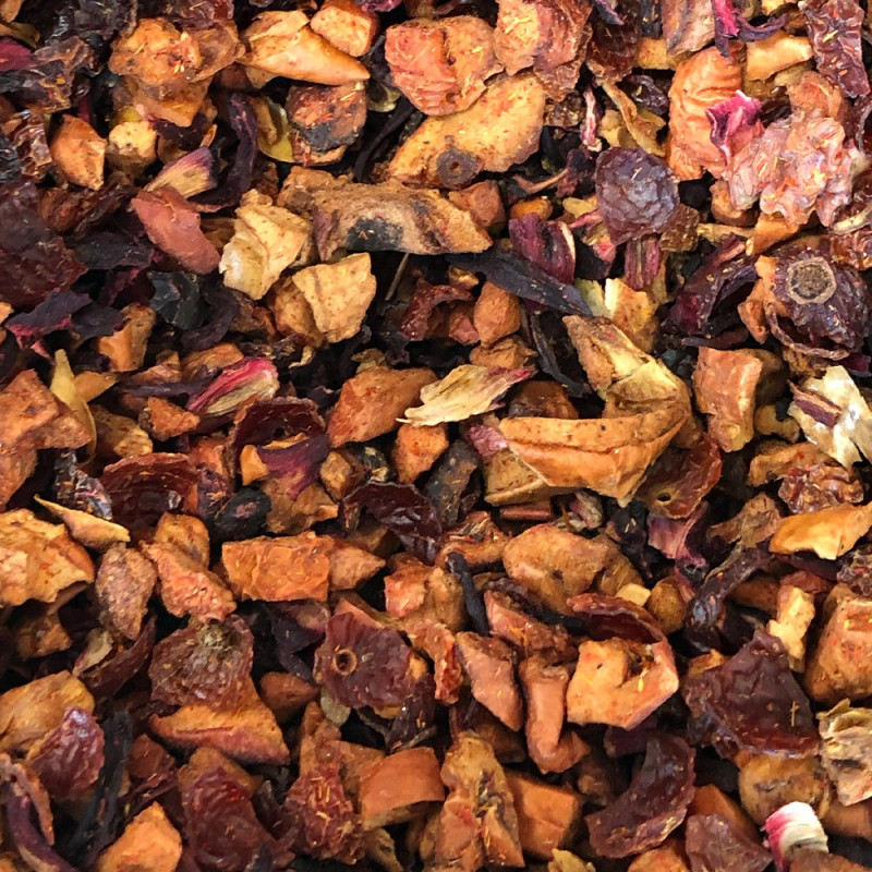 Croquez dans le fruit défendu… Infusion gourmande aux fruits et aux plantes, Pomme d’Amour est un mélange généreux de pommes caramélisées et de cannelle qui évoque les saveurs de l'enfance et surtout celles de Noël et des soirées fraîches d’hiver.