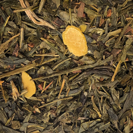 Un thé vert de Chine agrémenté de vrais morceaux de pommes confites, d'amandes grillées, d'une petite pointe de cardamome et de cannelle pour donner tout son peps à cet assemblage.