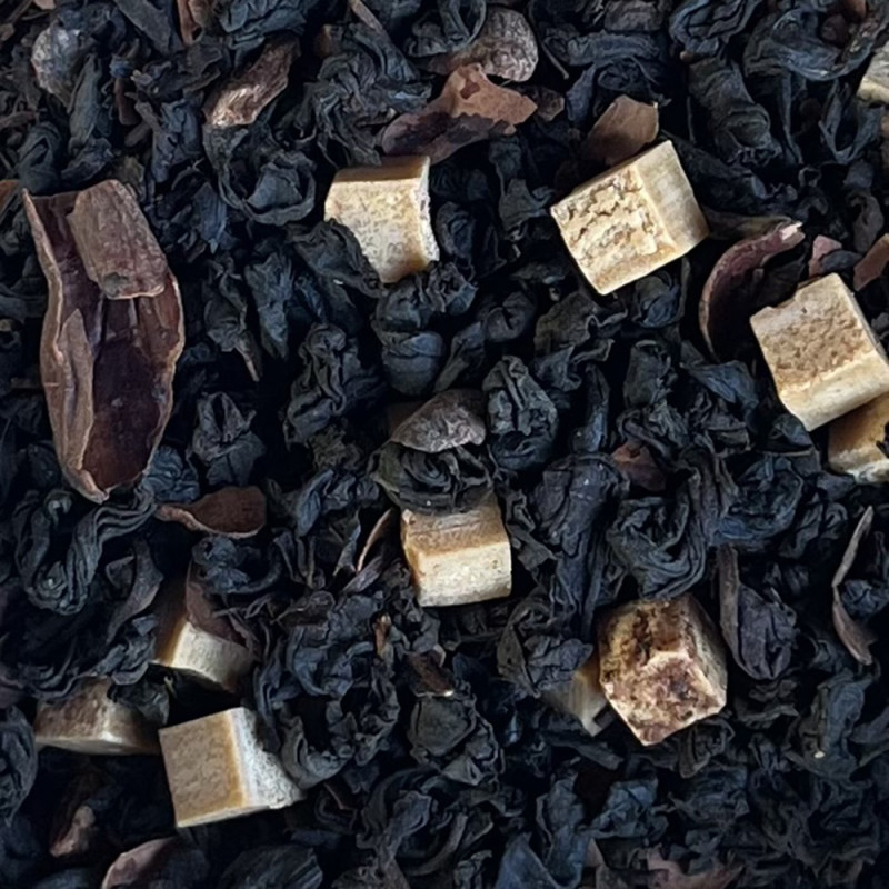 Thé noir aux épices de Noël, rhum, vanille, noisettes et fèves de cacao
