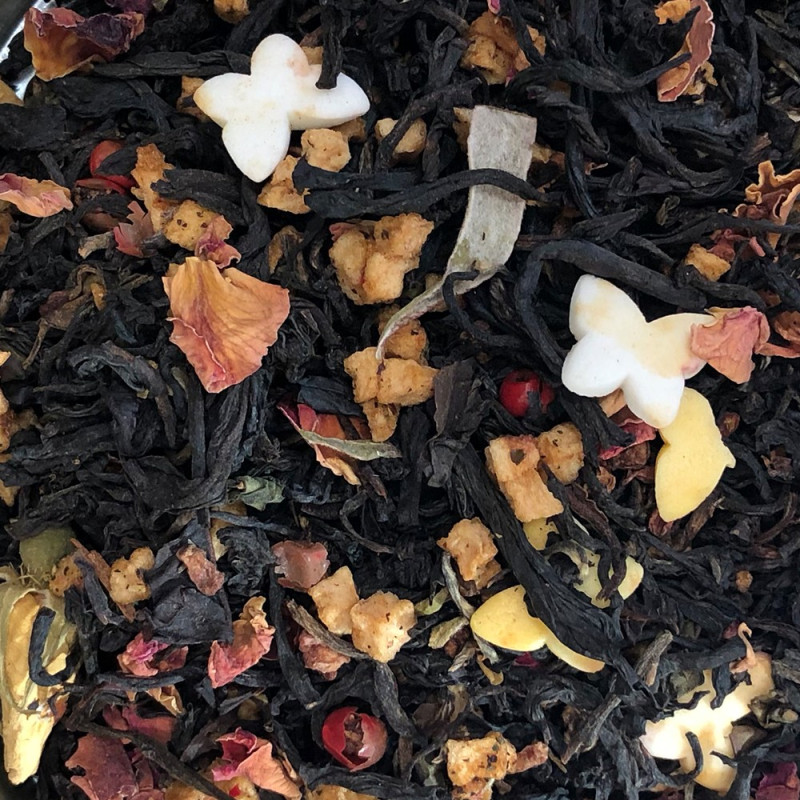 Thé noir semi-fermenté, fruits rouges vanillés, morceaux de pommes caramélisées, rose