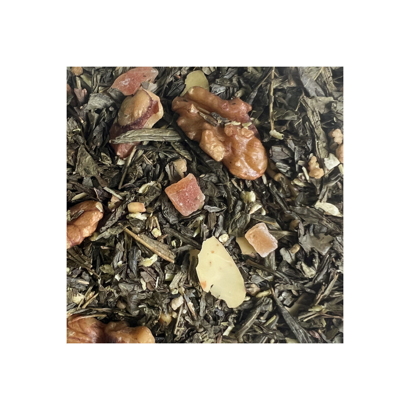 Thé vert aux fruits confits, nougatine, zestes d’agrumes et cerneaux de noix