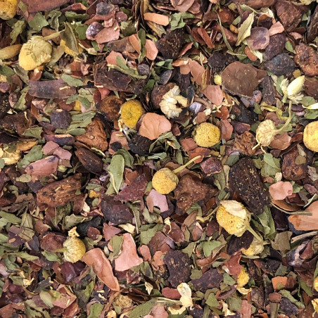 Coup de cœur assuré pour cette infusion assemblée de fins copeaux de fève de cacao avec camomille et quelques notes subtiles de fines feuilles de menthe. Dès la première gorgée, vous serez charmée par la fraîcheur et la légèreté de cette infusion !